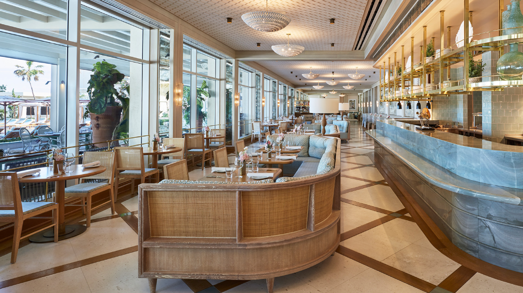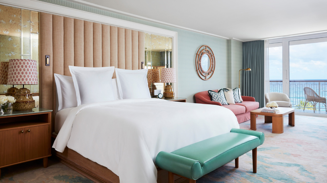 • Stylish Coastal Interiors — Rooms and suites reflect coastal elegance with pistachio and rose-toned palettes, floor-to-ceiling windows, and private balconies, evoking mid-century Floridian glamour refreshed for today.