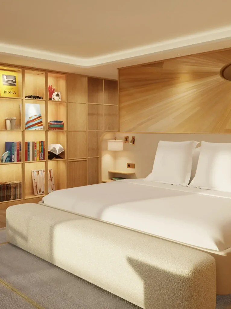 This isn’t just a cruise—it’s a fully customized, next-level yachting experience. The debut yacht is a 207-meter floating sanctuary with just 95 expansive suites, each designed with floor-to-ceiling windows, oversized terraces, and a spacious, residential feel. The showstopper? The Funnel Suite—a four-level, 9,600-square-foot indoor-outdoor retreat unlike anything else at sea.